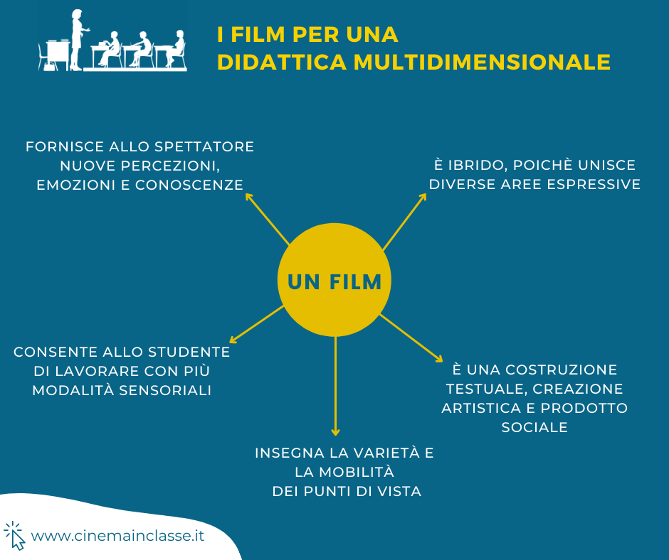 L’insieme delle diverse aree che si ritrovano in un film (come quella visiva, quella testuale e quella sonora) portano lo spettatore ad attivare diverse funzioni in modo sincrono. Sebbene questo possa destare qualche difficoltà da parte degli strumenti, specialmente nel capire a quale aspetto dare maggiore importanza, può insegnare tanto.